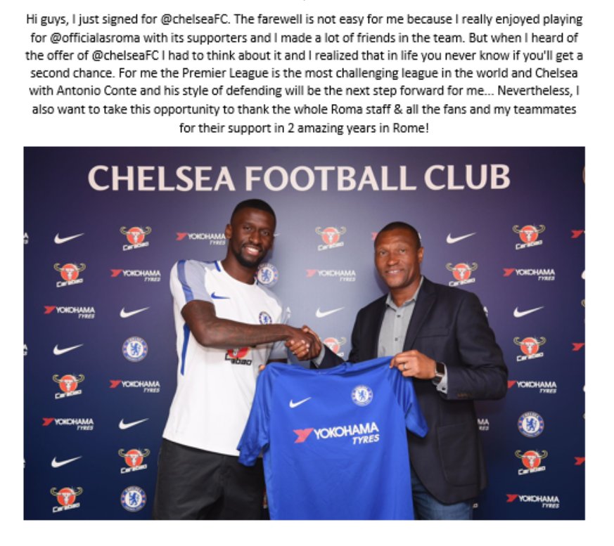 Čtyřiadvacetiletý Rüdiger se právě na Konfederačním poháru řadil k oporám německého týmu při tažení za zlatými medailemi, v Londýně nyní přebírá dres s číslem 2. Přichází po vydařené sezoně ve Věčném městě, kde startoval ve 36 soutěžních duelech, v nichž jednou skóroval a čtyřikrát asistoval.