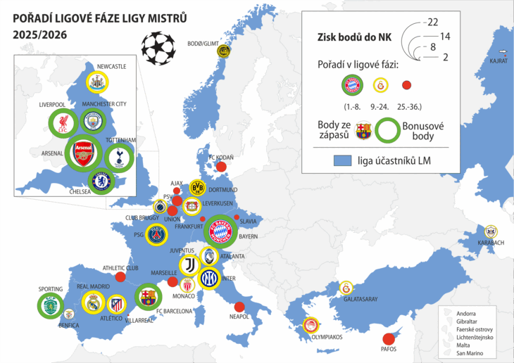 Neslavné loučení Slavie s Ligou mistrů, slibné představení Plzně v Evropské lize, ale také anglická dominance, portugalský posun či vážné řecké ohrožení. To jsou hlavní body posledního hracího týdne ligové fáze dvou nejprestižnějších klubových soutěží UEFA, ve kterém se rozhodlo o složení jarního play off. V předkole osmifinále se z českých klubů představí Plzeň v EL a Sparta se Sigmou v KL.