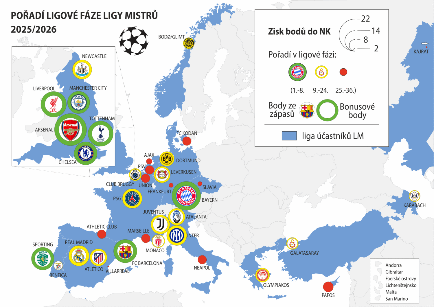 Neslavné loučení Slavie s Ligou mistrů, slibné představení Plzně v Evropské lize, ale také anglická dominance, portugalský posun či vážné řecké ohrožení. To jsou hlavní body posledního hracího týdne ligové fáze dvou nejprestižnějších klubových soutěží UEFA, ve kterém se rozhodlo o složení jarního play off. V předkole osmifinále se z českých klubů představí Plzeň v EL a Sparta se Sigmou v KL.