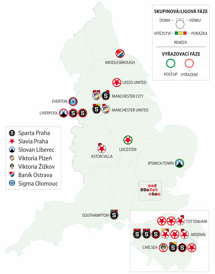 Srovnávat se s kolébkou fotbalu na klubové úrovni se Česko může pochopitelně pouze v evropských pohárech. Dle očekávání vycházejí kluby z Premier League ze zápasů s těmi českými daleko lépe. V historii samostatného Česka byl zápas Slavie proti Tottenhamu celkově již 49. měřením sil mezi oběma fotbalově poměrně rozdílnými světy. Vždyť taky pouze ve čtyřech z nich dokázal český tým vyhrát. Jednou se tak stalo ve skupinové fázi, třikrát ve vyřazovací. Z celkem 19 zápasů ve skupinové (nyní ligové) fázi vybojovala jediné vítězství Sparta doma proti Southamptonu (2016). Z 30 utkání v play-off se radovaly Slavia venku na Leicesteru (2021), Liberec doma proti tehdy druholigovému Ipswich Town (2002) a Slavia proti tehdy hvězdnému Leedsu (2000). Z těchto patnácti soubojů se český postup urodil dvakrát. Liberec přešel přes Ipswich Town a Slavia přes Leicester. Celková bilance mezi českým a anglickými týmy je z našeho pohledu 4-11-34 (ve skupinové/ligové fázi 1-3-15, ve vyřazovací 3-8-19).