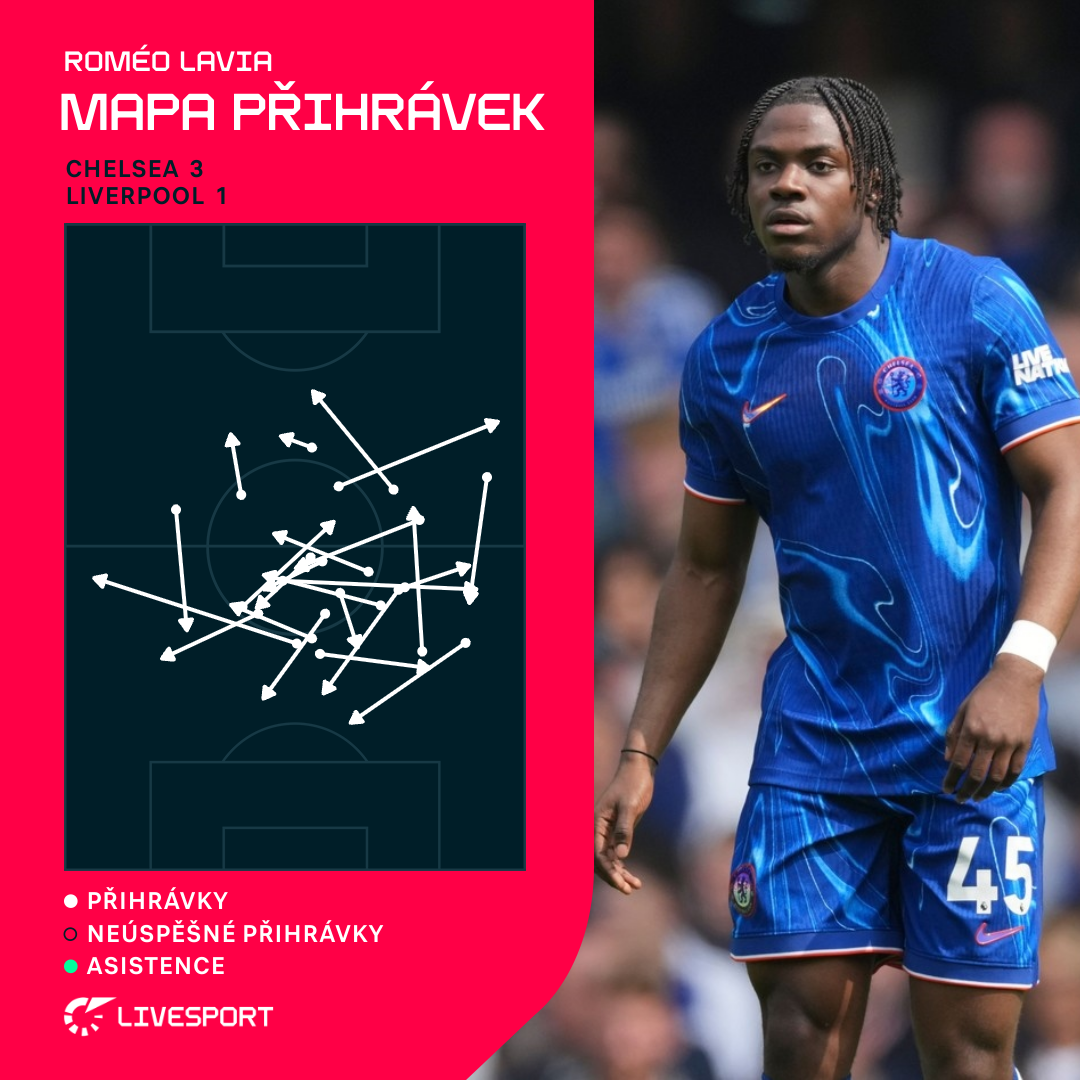 Většinu sezony vynechal vinou zranění. Když je ovšem fit, posouvá zálohu Chelsea o úroveň výš. Roméo Lavia (21) se sice při výhře 3:1 nad Liverpoolem neobjevil na listině střelců, přesto byl klíčovým strůjcem úspěchu Blues. Neminul jedinou přihrávku, nebojí se přitom progresivními pasy rozbíjet záložní řady. "S Roméem jsme lepší tým," nešetřil chválou kouč Enzo Maresca (45).