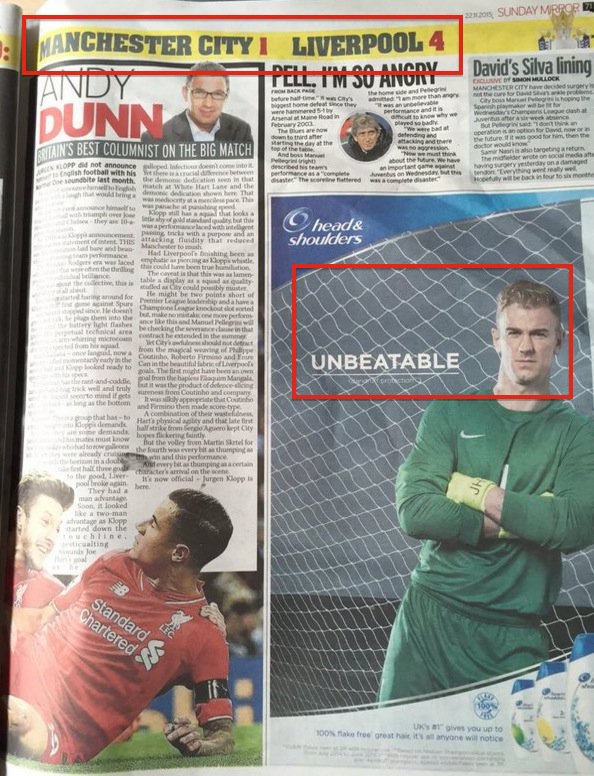 Manchester City byl před začátkem kola na prvním místě tabulky, jeho pád až na třetí příčku se však rýsoval naprosto přímočaře. Druhý gól utkání opět zinscenovali červení kolegové Roberto Firmino a Philippe Coutinho. První jmenovaný uvolnil toho druhého ve vápně, a zatímco Demichelis létal po hřišti jako vítr v bedně, Coutinho mezi nohama Harta rozvlnil síť.