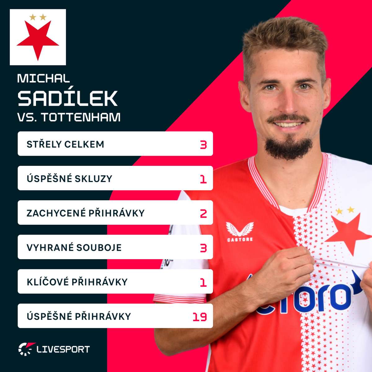 Sadílek si připsal tři střelecké pokusy. V prvním poločase hlavičkoval z dobré pozice mimo tři tyče, mrzela ho ale především situace ze 70. minuty, kdy měl po přihrávce Lukáše Provoda čas zamířit z hranice vápna.