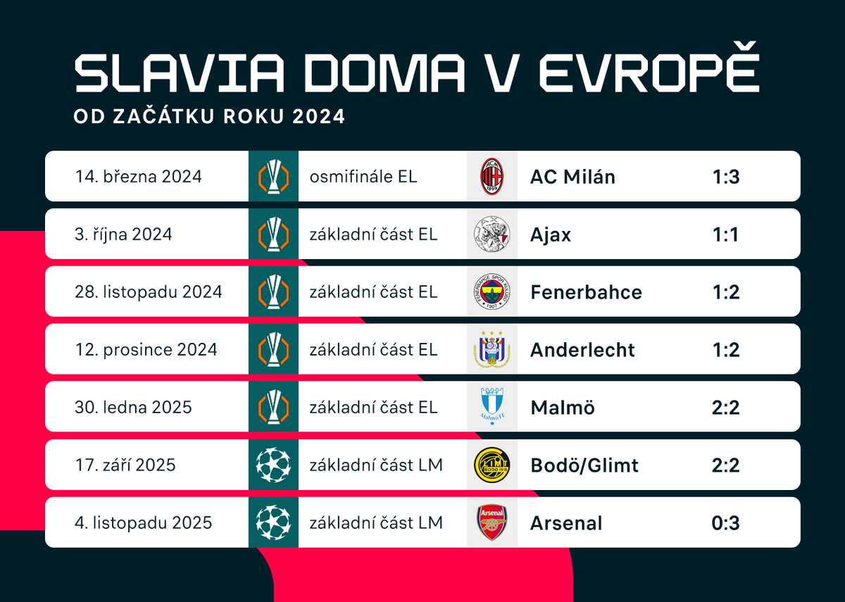 Pojem zápas na stadionu Slavie sice možná budí obavy u ligové konkurence, v pohárové Evropě však červenobílí na svém vršovickém hradě hostí návštěvníky z daleka královsky. Na domácí výhru v hlavní soutěži čekají od prosince 2023, kdy v Evropské lize spláchli Servette Ženeva 4:0.