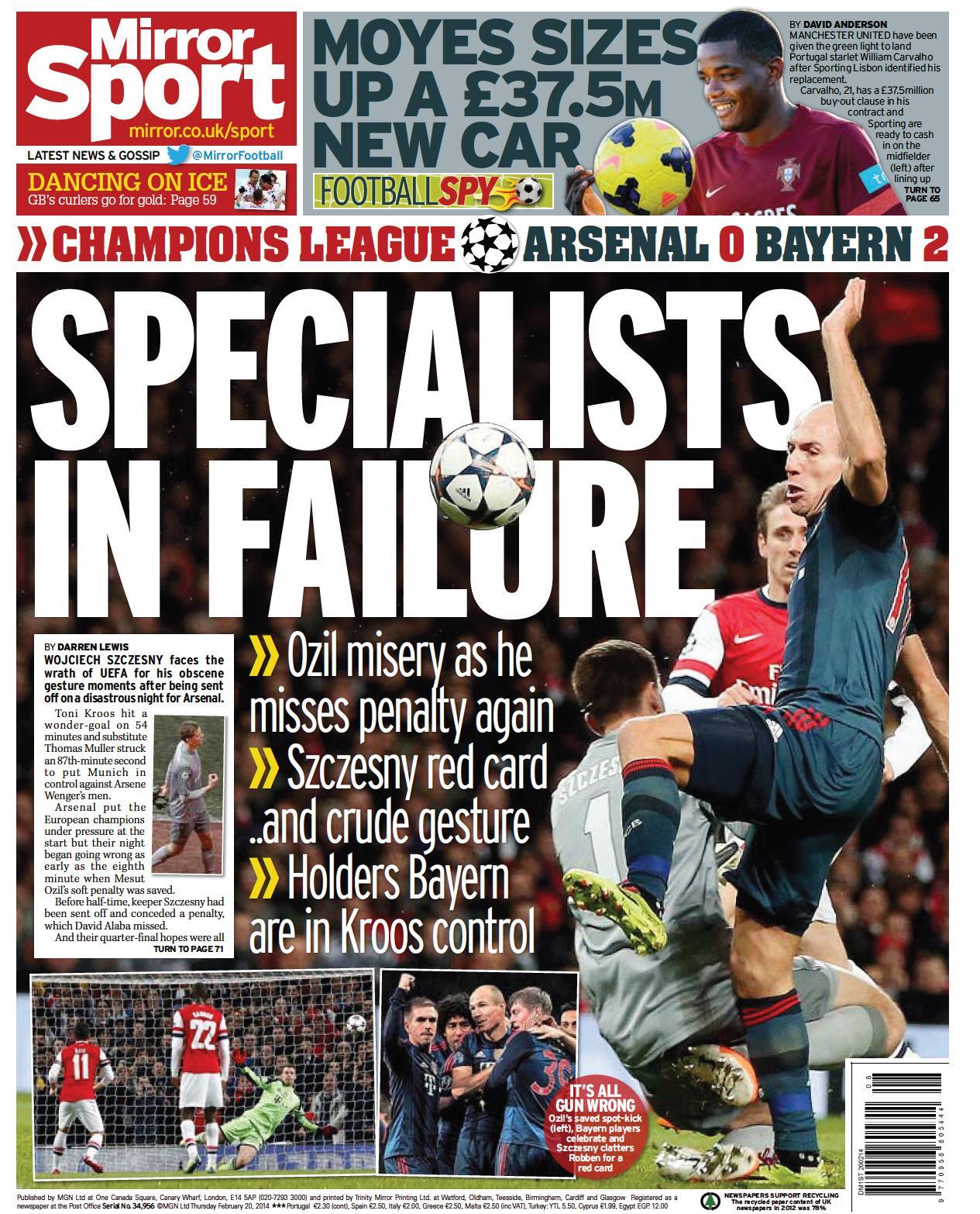 skoda no,arsenal mel slusnou sanci a asi i vetsi nez se cekalo.nepromenili sance,ozil uplne vypustil penaltu,nechapu proc ji sel kopat.z toho soku uz se nezpamatovali.pak penalta a zaslouzena cervena a konec.aspon se muzou soustredit na ligu, ale to City taky.bayern zcela zaslouzene vyhral a byl to opravdu smutny pohled cely druhy polocas.opet se potvrdilo ze wenger potreboval v zime nutne koupit utocnika,ale nevim jestli byla sance na nekoho kdo by mohl hrat lm.giroud jednou zaskoruje do cizi branky a cely arsenal je v utoku bezmocny.
