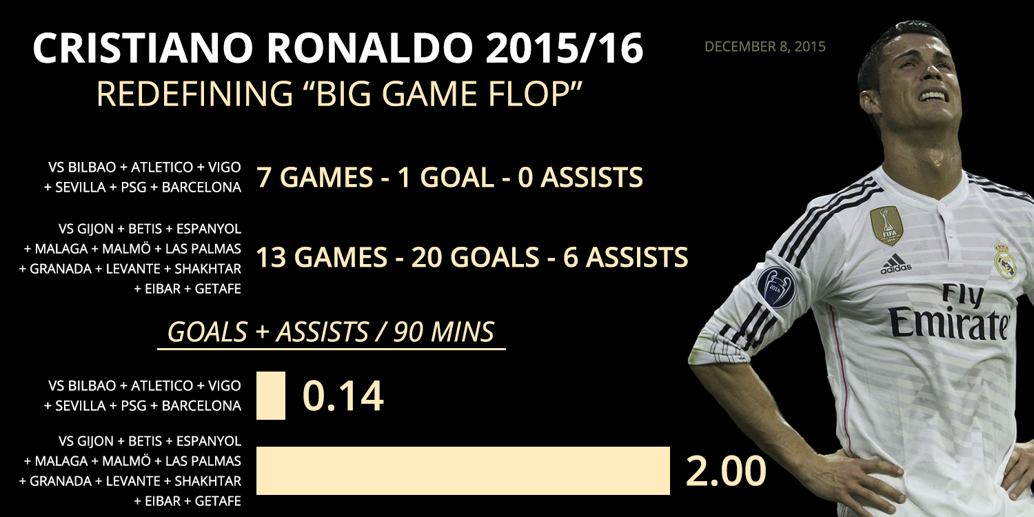 Ronaldo v letošní sezóně ( od Srpna) nedal už ve 13 zápasech gól!!! a pak dá 5 gólů Espanolu,6 gólů Malmo ( 2 zápasy) a 5 gólů Šachtoru (2 zápasy) - slabým skoro nebránícím týmůn a vy z něho dělátepomalu génia ale když ho někdo dobře brání tak si ani neškrtne protože nedokáže obejít ani jednoho beka . Kolikrát se tomu směju - přešlapovačka k ničemu přihrát na 3 metry nejblížšímu spoluhráči a mazat do malýho vápna - to je celá jeho hra !!!