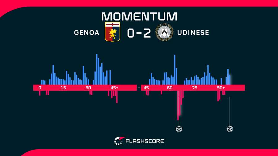 Udinese, povzbuzené tímto rozhodnutím, využilo svou šanci a otevřelo skóre. Ekkelenkamp si naběhl do vápna domácích a hlavou zužitkoval přesný centr Nicoly Zaniola. V zápase s minimem šancí už Janov nedokázal zareagovat a Udinese si pojistilo tři body, když Davis v šesté minutě nastavení zvýšil na 2:0 po rychlém brejku, kdy domácí otevřeli hru. Pro Udinese jde o první venkovní vítězství po téměř dvou měsících.